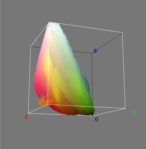 In this image there are 515,562 unique colours. Here’s what is looks like as a 3D RGB histogram: