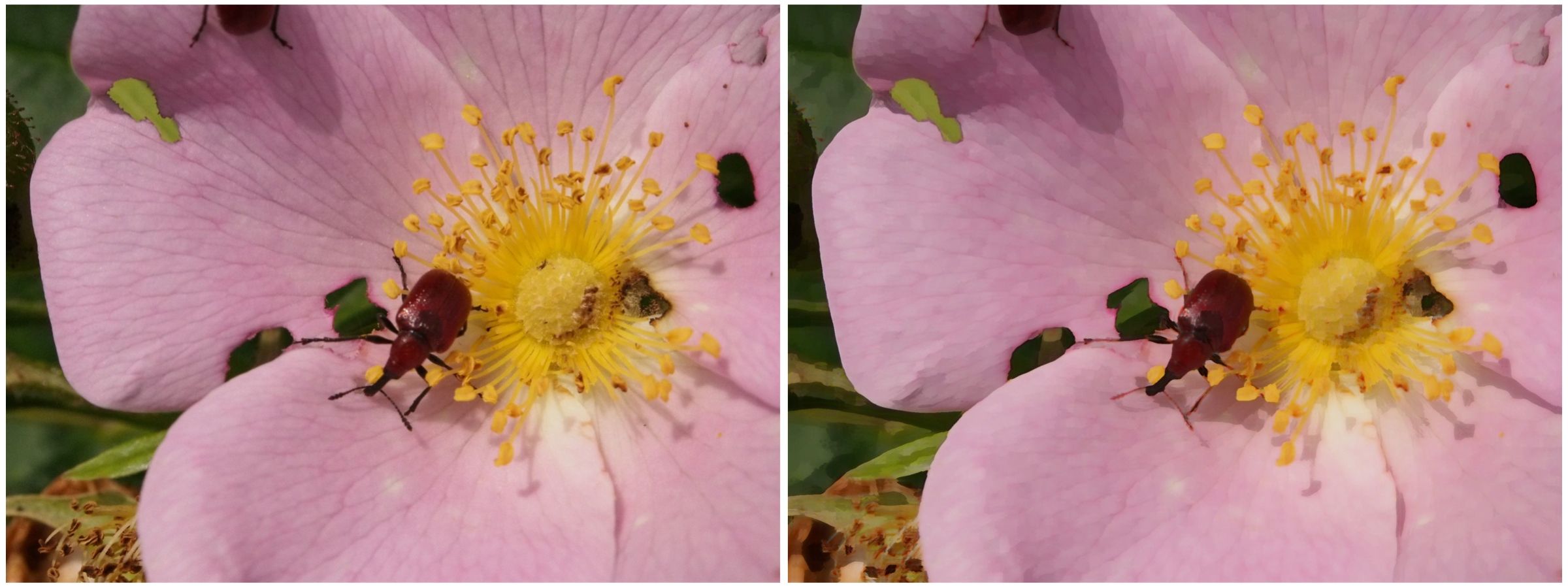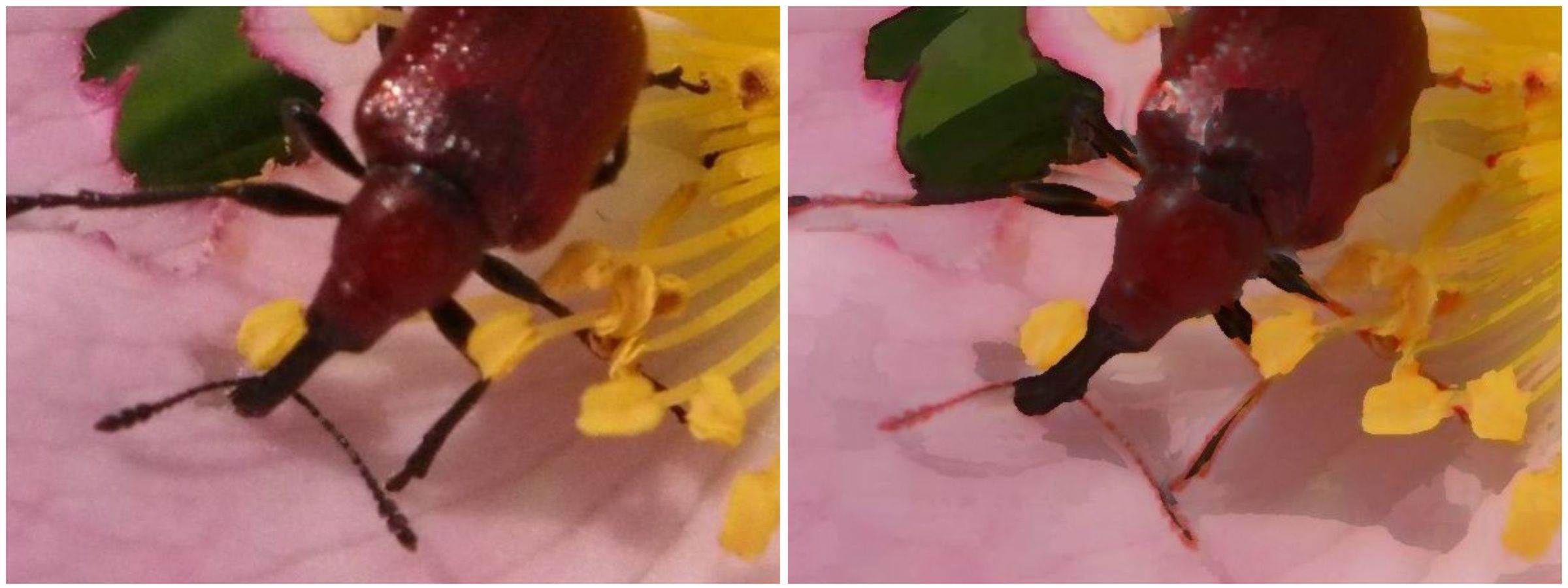The Kuwahara is based on local area “flattening”, removing detail in high-contrast regions while protecting shape boundaries in low-contrast areas. The only issue with Kuwahara is that is can produce somewhat “blocky” results. Choosing a different shaped “neighbourhood” will have a different affect on the image. A close-up view of the beetle in the image above shows the distinct edges of the processed image. Note also how some of the features have changed colour slightly (the beetles legs have transformed from dark brown to a pale brown colour), due to the influence of the surrounding pink petal colour.