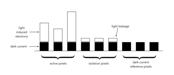 These extra photosites receive a signal that tells the sensor how much dark current (unwanted free electrons generated in the CCD due to thermal energy) has built up during an exposure, essentially establishing a reference dark current level. The camera can then use this information to compensate for how the dark current contributes to the effective (active) photosites by adjusting their values (through subtraction). Light leakage may occur at the edge of this band of “extra” photosites, and these are called “isolation” photosites. The figure below shows the establishment of the dark current level.