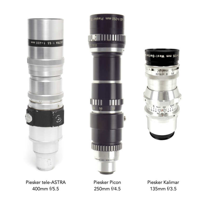 Paul Piesker & Co. was founded in 1936 as a Berlin manufacturer of lenses and lens accessories for reflex cameras (in West Germany). After WW2 the company focused on lenses with long focal lengths for the Exakta and cameras with M42 mounts. Like its competitors, Astro-Berlin, and Tewe, Piesker lenses don’t seem to very common, at least not in Europe. Most of the lenses produced seem to have been for the US market, where they appeared in ads in Popular Photography in the mid 1950s. The lenses can also be found under the “Kalimar” trademark, and also rebranded for Sterling Howard, under the trademark “Astra”, and “Voss” (in addition to other brands: Picon, Votar, Telegon). Production at Piesker was discontinued in 1964.