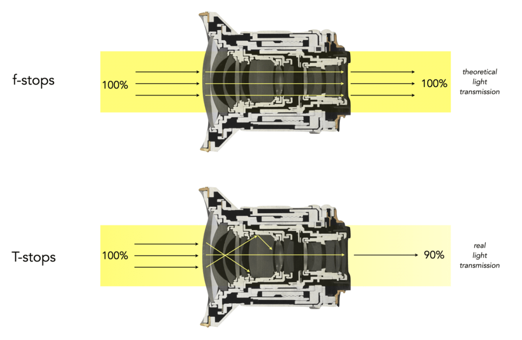Light transmittance (LT) is the term for the actual amount of light that makes it to the film/sensor, i.e. the percentage of light that goes through an optical instrument, often expressed as the light transmission rate. What this means, is that a lens with a maximum aperture of f/1.2 could potentially transmit less light, which could be equivalent to say f/1.4 in terms of brightness. The latter number is what is often referred to as a “T-stop”, or Transmission-stop, which is basically an adjusted f-stop that takes into account this light loss. So an f-stop is essentially a “theoretical” measurement, whereas a t-stop is an actual measurement that is tested when the lens is calibrated.