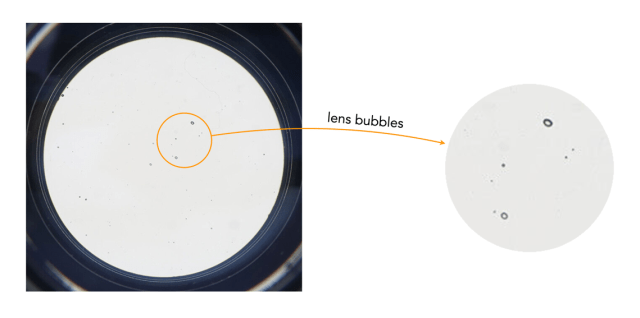 Some lenses pre-1970 had defects caused by the optical glass manufacturing process which left a few pin-prick sized air bubbles inside the glass. These bubbles may come from different sources, but in most cases the source is imperfect refining. They look like tiny dust specks when viewed with the naked eye, but if magnified, they are indeed bubbles.