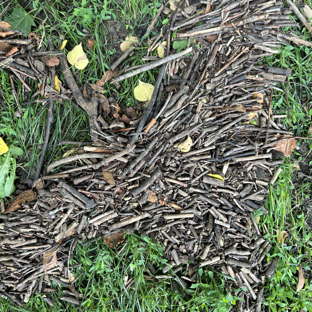 A lot of photographic inspiration often comes from nature. Last week I was walking in a park a few hours after the torrential “100 year storm”, and noticed that all the twigs lying on the ground had been washed down the grassy hill, forming these clumps of miniature log-jams. They were just a lot of fun from a artistic viewpoint, showing again that nature truly knows how to do randomized, chaotic art.