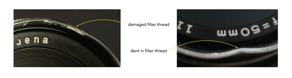 No vintage lens will be in perfect condition, unless it has sat in its box stored away somewhere and never been used (the so-called “new old-stock”). The first thing to check is what the lens looks like externally. Many vintage lens bodies are largely constructed of metal which has a tendency to scratch and dent. Scratches on the lens body are usually not that big a deal, dents are another matter altogether. Usually a dent will typically occur at either end of the lens, and can signify that the lens has been dropped. Some lenses are of course built like tanks, and can withstand a drop better than others. Damage to the lens mount will make it almost impossible to mount the lens. Conversely damage at the thread end will mean an inability to mount a filter (it means either replacing the front component, or for a minor issue using a lens vise to restore the thread).