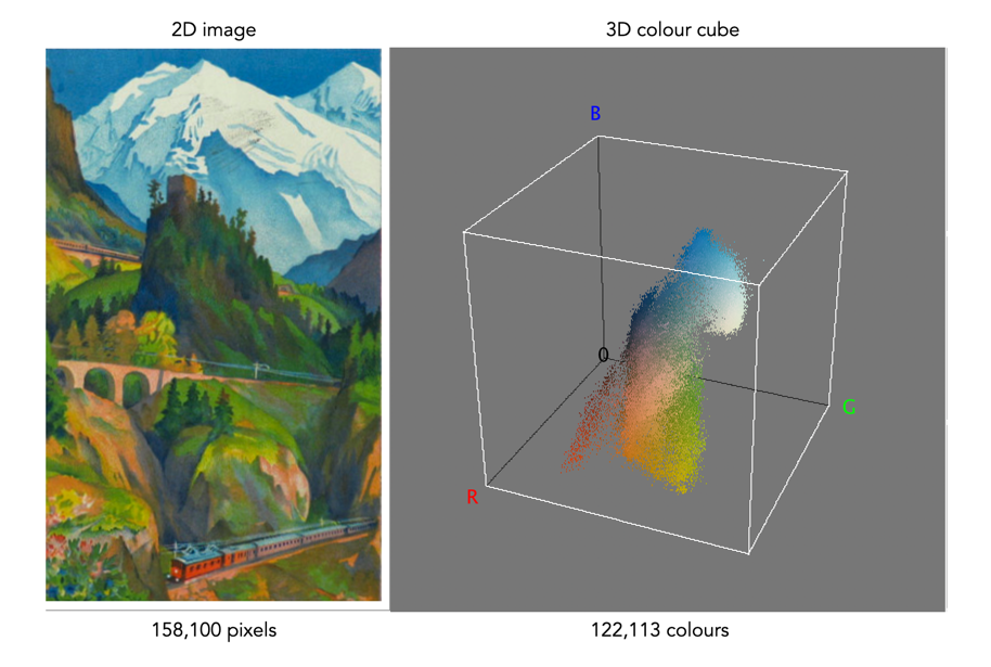 One way of visualizing the R,G,B, components of an image is by means of a 3D colour cube. An example is shown in Figure 3. The RGB image shown has 310×510, or 158,100 pixels. Next to it is a colour cube with the three axes, R, G, and B, each with a range of values 0-255, producing a cube with 16,777,216 elements. Each of the images 122,113 unique colours is represented as a point in the cube (representing only 0.7% of available colours).