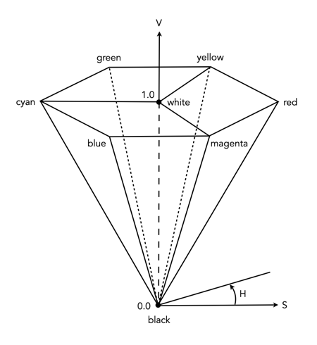 HSV is derived from the RGB model, and is sometimes known as HSB (Hue, Saturation, Brightness) and characterizes colour in terms of hue and saturation. It was created by Alvy Ray Smith in 1978 [1]. Now the space is traditionally represented using an an upside-down hex-cone or six-sided pyramid – however mathematically the space is actually conceptualized as a cylinder. HSV/HSB is a perceptual colour space, i.e. it decomposes colour based on how it is perceived rather than how it is physically sensed, as is the case with RGB. This means HSV (and its associated colour spaces) is more aligned with a more intuitive understanding of colour.