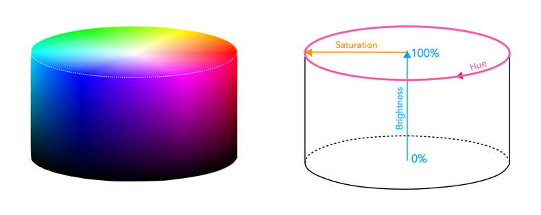 The top of the HSB colour space cylinder showing hue and saturation (left), and a slice through the cylinder showing brightness versus saturation (right).