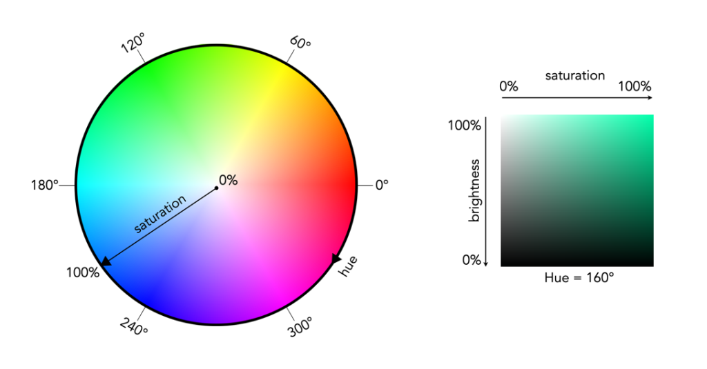 Hue represents the chromaticity or pure colour. It is specified by an angular measure from 0 to 360° – red corresponds to 0°, green to 120°, and blue to 240°.