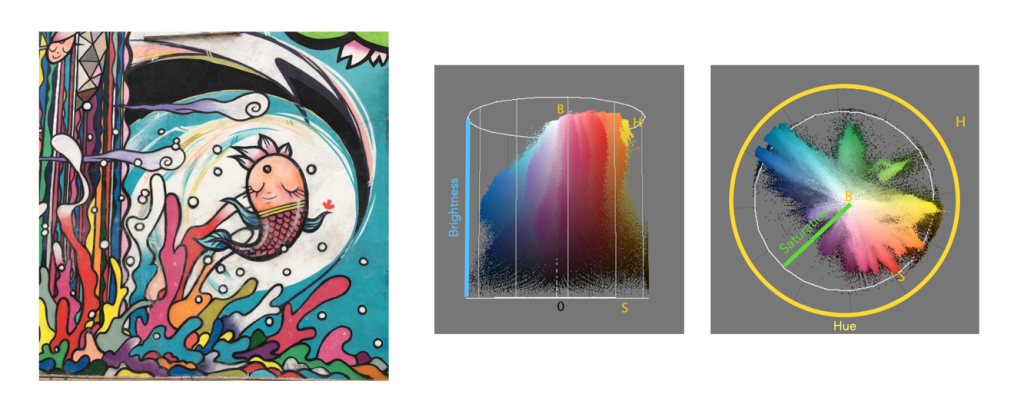 The reality is that few if any real pictures contain 16 million colours. Here are some examples (all images contain 9 million pixels). Note the images are shown in association with the hue distribution from the HSB colour-space. The first example is a picture of a wall of graffiti art in Toronto. Now this is an atypical image because it contains a lot of varied colours, most images do not. This image has only 740,314 distinct colours – that’s only 4.4% of the potential colours available.