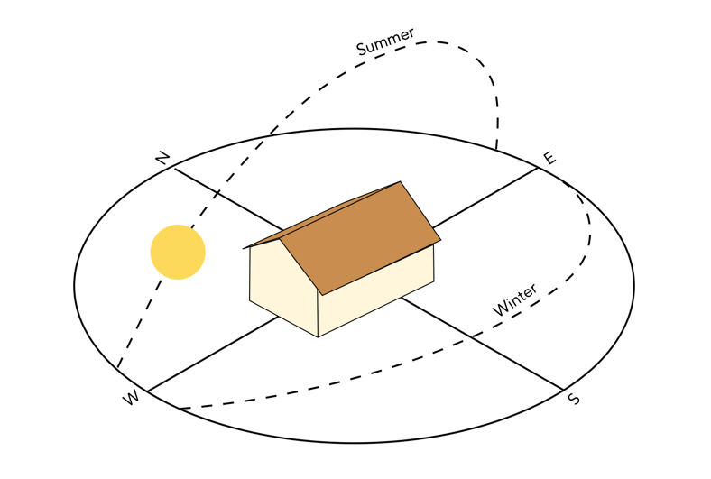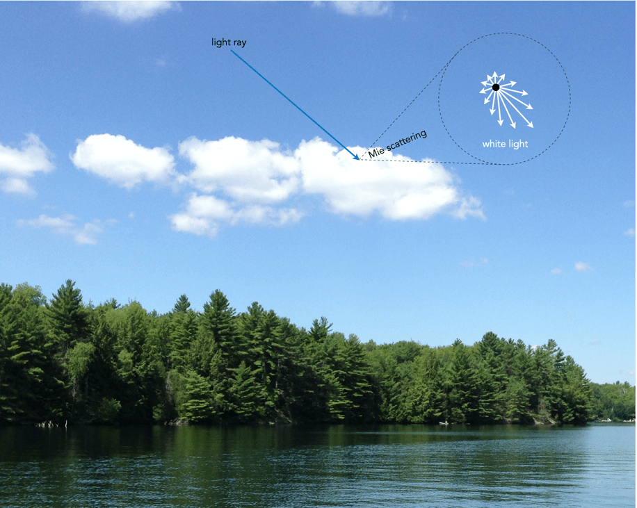 During the summer months, when the sun is higher in the sky, light does not have to travel as far through the atmosphere to reach our eyes. Consequently, there is less Rayleigh scattering. Blue skies often appear somewhat hazy, veiled by a thin white sheen. When light encounters large particles suspended in the air, like dust or water vapour droplets, wavelengths are scattered equally. This process is known as Mie scattering, and produces white-coloured light, e.g. making clouds appear white. In summer in particular, increased humidity increases Mie scattering, and as a result the sky tends to be relatively muted, or pale blue.