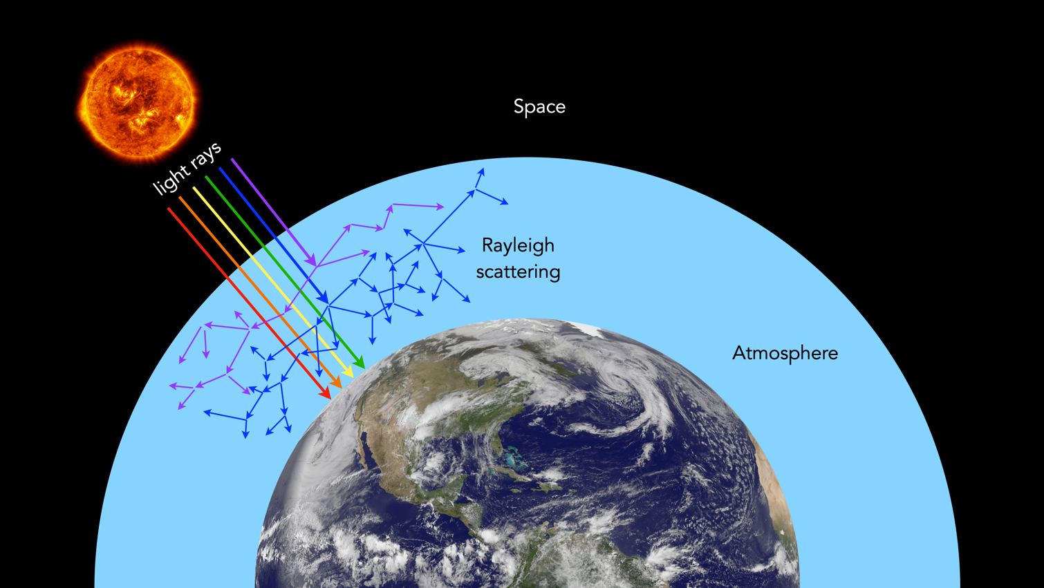 An illustration of how Rayleigh Scattering works in the atmosphere.