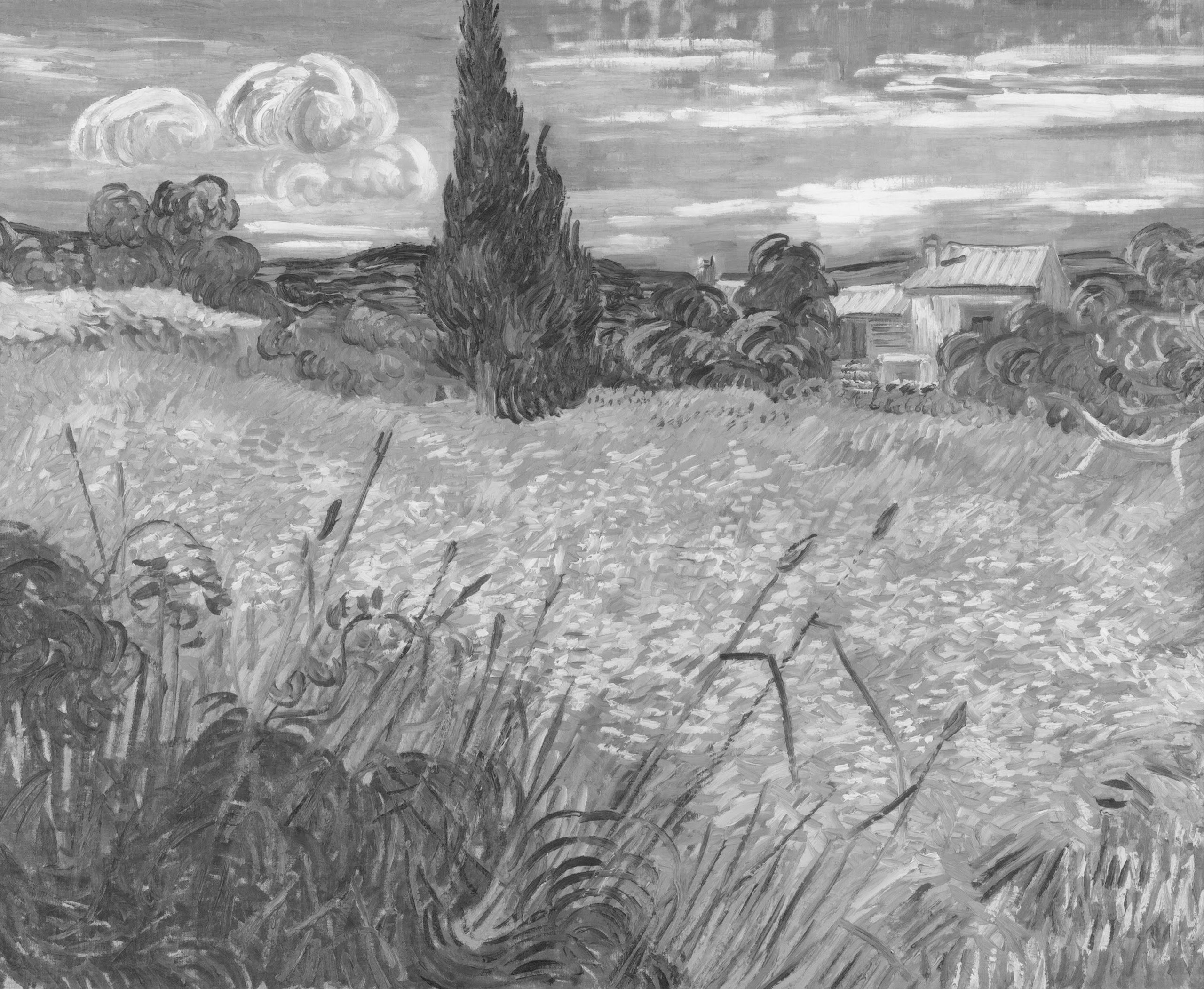Below is a comparison of Vincent van Gogh’s Green Wheat Field with Cypress (1889), with a version containing only luminance. Our ability to recognize the various regions of vegetation and to perceive their three-dimensional shape and the spatial organization of this scene depends almost entirely on the luminance of the paints used, and not their colours.