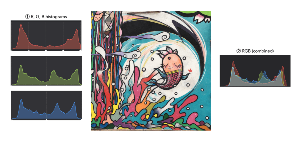The information in the three histograms is essentially decoupled, and does not provide a cohesive interpretation of colours in the image, for that you need a 3D image of sorts. Modifying one or more of the individual histograms will just lead to a colour shift in the image, which is fine if that is the what is to be achieved. Should you view the colour histograms on a camera viewscreen? I honestly wouldn’t bother. They are more useful in an image manipulation app, but not in the confines of a small screen – stick to the luminance histogram.