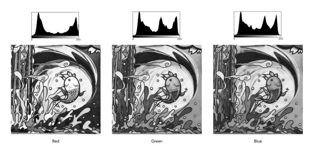 But to understand it better, we need to look at what information is contained in a colour image. An RGB colour image can be conceptualized as being composed of three layers: a red layer, a green layer, and a blue layer. Figure 2 shows the three layers of the image in Figure 1. Each layer represents the values associated with red, green, and blue. Each pixel in a colour image is therefore a set of triplet values: a red, a green, and a blue, or (R,G,B), which together form a colour. Each of the R, G, and B components is essentially an 8-bit (grayscale) image, then can be viewed in the form of a histogram (also shown in Figure 2 and nearly always falsely coloured with the appropriate red, green or blue colour).