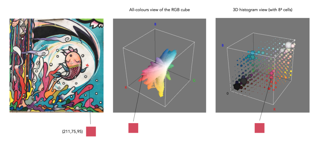 To understand a colour image further, we have to look at the RGB colour model, the method used in most image formats, e.g. JPEG. The RGB model can be visualized in the shape of a cube, formed using the R, G, and B data. Each pixel in an image has an (R, G, B) value which provides a coordinate in the 3D space of the cube (which contains 2563, or 16,777,216 colours). Figure 3 shows two different ways of viewing image colour in 3D. The first is an all-colours view of the colours. This basically just indicates all the colours contained in the image without frequency information. This gives an overall indication on how colours are distributed. In the case of the example image, there are 526,613 distinct colours. The second cube is a frequency-based 3D histogram, grouping like data together in “bins”, in this example the 3D histogram has 83 or 512 bins (which is honestly easier to digest than 16 million-odd bins). Within the image there is shown one pixel with the RGB value (211,75,95), and its location in the 3D histograms.