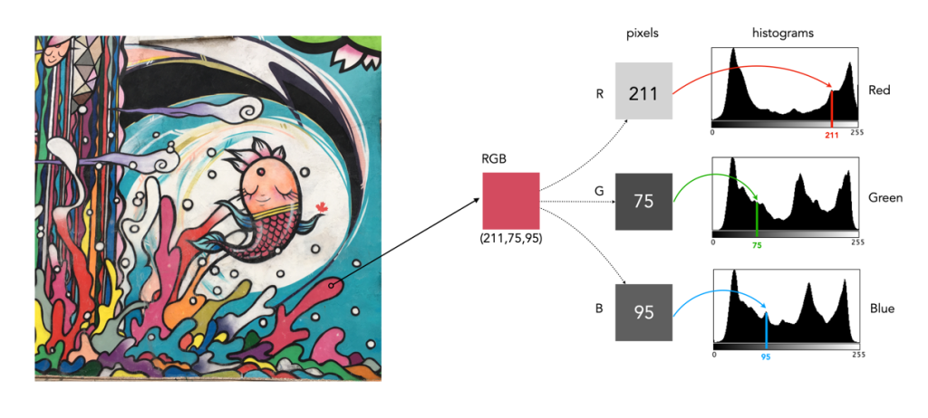 Fig.4: A single RGB pixel shown in the context of the separate histograms.