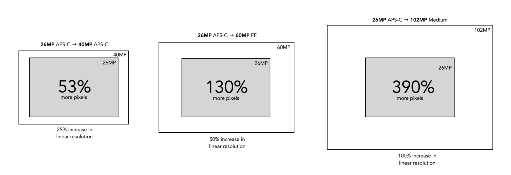 So is the 40MP camera better than the 26MP camera? It does produce images with slightly more resolution, because there are more photosites on the sensor. But the linear dimensions may not warrant the extra cost in going from 26MP to 40MP (US$800 versus US$1400 for the sample Fuji cameras, body only). The 40MP sensor does allow for a better ability to crop, and marginally more detail. It also allows for the ability to print larger posters. Conversely the images are larger, and take more computational resources to process.