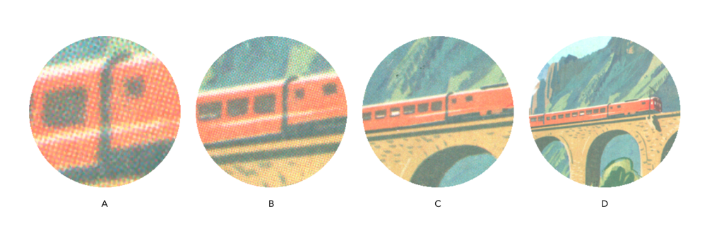 Human perception is then linked to the resolving power of the eye. Resolving power is the ability of the eye to distinguish between very small objects that are very close together. To illustrate this further, consider the images shown in Fig.3. They have been extracted from a digital scan of a vintage brochure taken at various enlargement scales. When viewing the brochure it is impossible to see the dots associated with the printing process, because they are too small to discern (and that’s the point). The original, viewed on the screen is shown in Fig.3D. Even in Fig.3C it is challenging to see the dot pattern that makes up the print. In both Fig.3A and 3B, the dot pattern can be identified. It is no different with any picture. But looking at the picture close up, the perception of the picture is one of blocky, dot matrix, not the continuous image which exists when viewed from afar.
