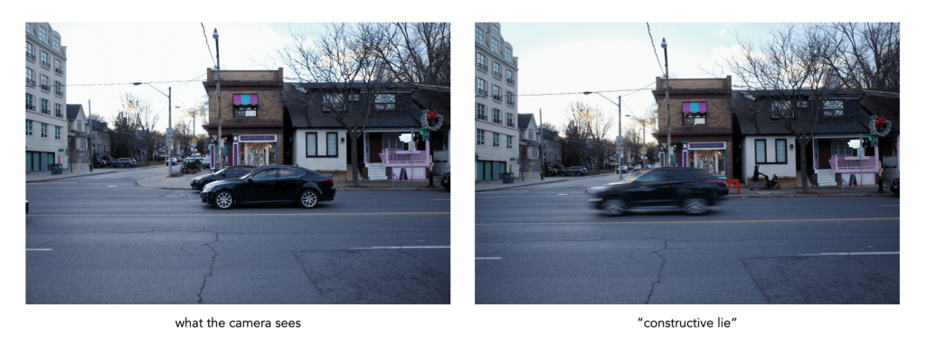 Consider as an example, cars driving down a road. Since your eyes can follow the cars in transit, you can perceive them in the form of sharp images, while understanding that the cars are actually moving. A camera, using the appropriate fast shutter speed, will freeze the scene, effectively giving the erroneous impression that the cars on the road are standing still. There is no real difference between a picture of the cars in motion, or standing still. Motion can be rendered in the photograph with blur – using a slow shutter speed will cause a slight blur in the rendering of the picture. The eye does not see this blur in real life, so the photograph would not be true, but rather a constructive lie. The resulting image is much more descriptive of the scene.