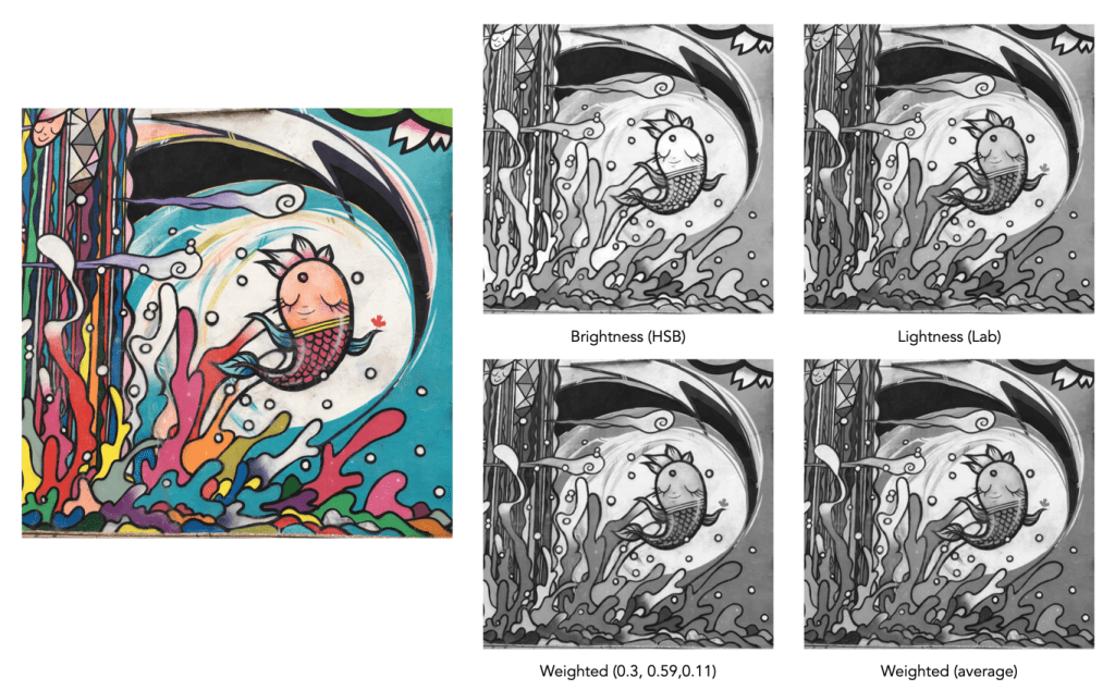 - Combine all three channels of the RGB colour space, using a particular weighted formula.