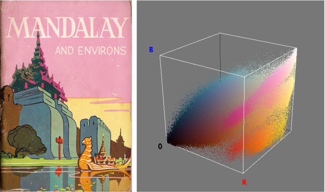 Figure 2 illustrates an RGB cube for a colour image. Notice that while the pink colour of the sky looks somewhat uniform in the image, it is anything, showing up as a swath of various shades of pink in the RGB cube. There are 275,491 unique colours in the Fig.2 image. Every possible colour corresponds to a point within the RGB colour cube, and is of the form: Cxyz = (Rx,Gy,Bz). For example Fig.3 illustrates three colours extracted from the image in Fig.2.