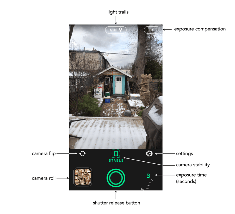 The app is very easy to use. Below the viewing window are a series of basic controls: camera flip; camera stabilization, and settings. The stabilization control, when activated, provides a small visual feature that determines when the iPhone is STABLE. As Spectre can perform a maximum of 9 seconds worth of processing, stabilization is an important attribute. The length of exposure is controlled by a dial in the lower-right corner of the app – you can choose between 3, 5, and 9 seconds. The Settings really only allows the “images” to be saved as Live Photos. The button at the top-middle turns light trails to ON, OFF, or AUTO. The button in the top-right allows for exposure compensation, which can be adjusted using a slider. The viewing window can also be tapped to set the focus point for the shot.