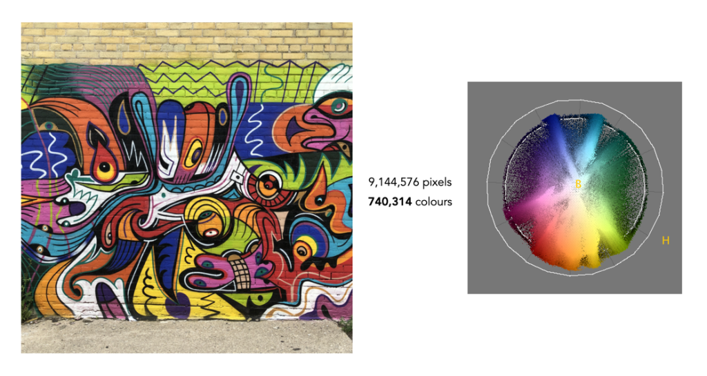 The reality is that few if any real pictures contain 16 million colours. Here are some examples (all images contain 9 million pixels). Note the images are shown in association with the hue distribution from the HSB colour-space. The first example is a picture of a wall of graffiti art in Toronto. Now this is an atypical image because it contains a lot of varied colours, most images do not. This image has only 740,314 distinct colours – that’s only 4.4% of the potential colours available.