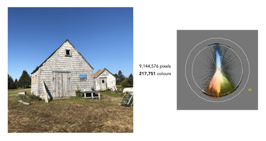 The next example is a more natural picture, a picture of two building (Nova Scotia). This picture is quite representative of images such as landscapes, that are skewed towards quite a narrow band of colours. It only contains 217,751 distinct colours, or 1.3% of the 16.77 million colours.