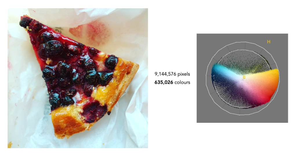 Finally we have foody-type image that doesn’t seem to have a lot of differing colours, but in reality it does. There are 635,026 (3.8%) colours in the image. What these examples show is that most images contain fewer than one million different colours. So while there is the potential for an image to contain 16,777,216 colours, in all likely they won’t.