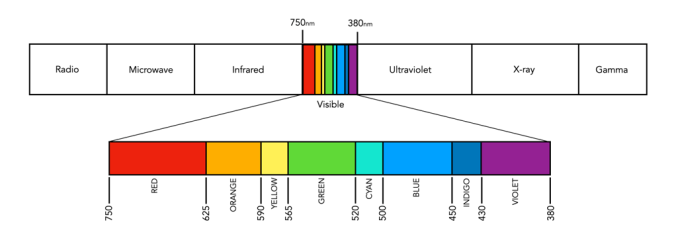 The colour we interpret will also be different based on the time of day, lighting, and many other factors. Another thing to consider with light is its colour temperature. Colour temperature uses numerical values in degrees Kelvin to measure the colour characteristics of a light source on a spectrum ranging from warm (orange) colours to cool (blue) colours. For example natural daylight has a temperature of about 5000 Kelvin, whereas sunrise/sunset can be around 3200K. Light bulbs on the other hand can range anywhere from 2700K to 6500K. A light source that is 2700K is considered “warm” and generally emits more wavelengths of red, whereas a 6500K light is said to be “cool white” since it emits more blue wavelengths of light.