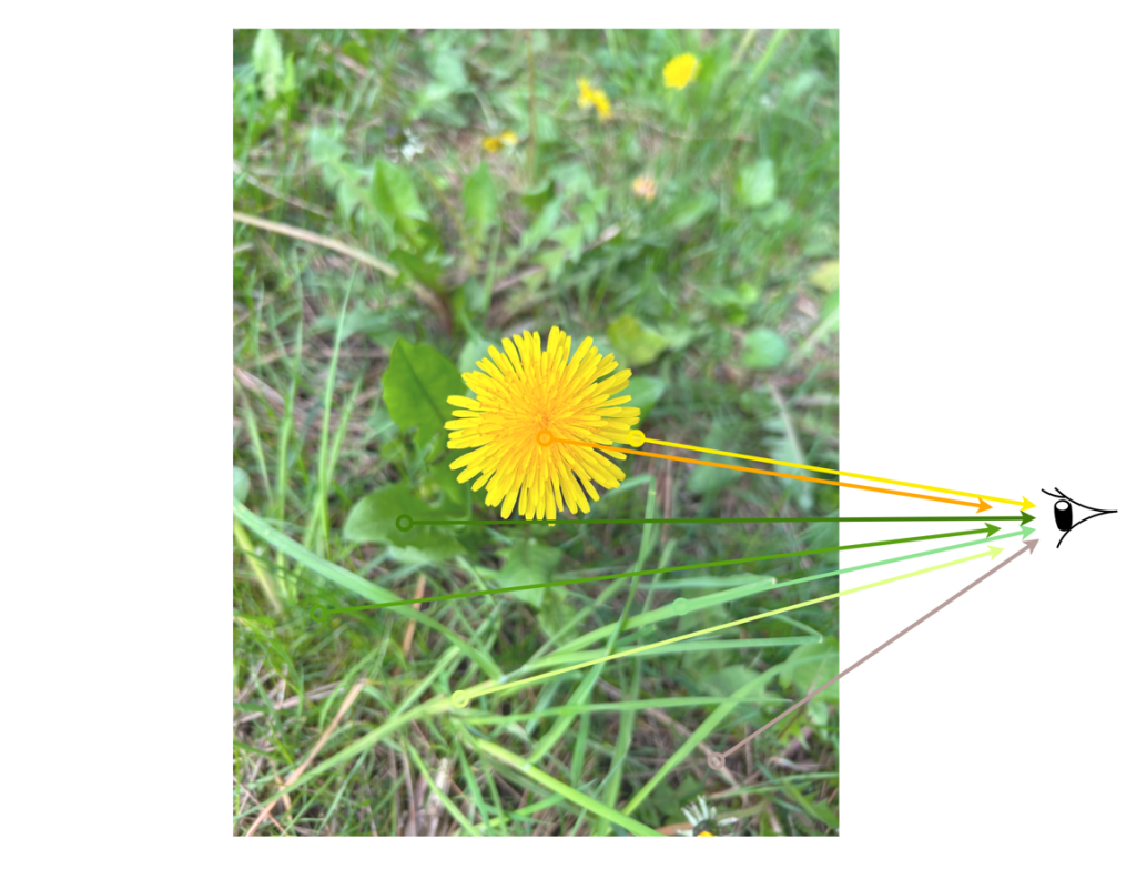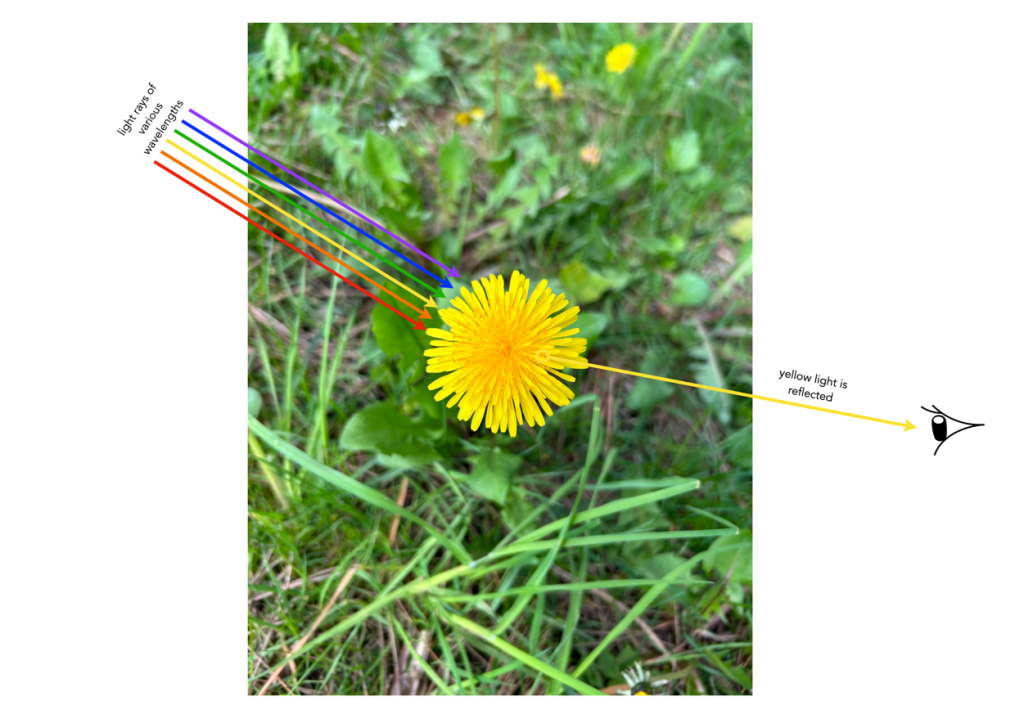 It is this visible light that builds the colour picture in our minds, or indeed that which we take with a camera. An object will be perceived as a certain colour because it absorbs some colours (or wavelengths) and reflects others. The colours that are reflected are the ones we see. For example the dandelion in the image below looks yellow because the yellow petals in the flower have absorbed all wavelengths of colour except yellow, which is the only colour reflected. If only pure red light were shone onto the dandelion, it would appear black, because the red would be absorbed and there would be no yellow light to be reflected. Remember, light is simply a wave with a specific wavelength or a mixture of wavelengths; it has no colour in and of itself. So technically, there is really no such thing as yellow light, rather, there is light with a wavelength of about 590nm that appears yellow. Similarly, the grass in the image reflects green light.