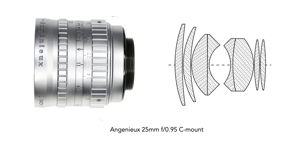 The P.Angenieux Paris 25mm f0.95 Type M1 was developed in 1953. The patent for the lens, was issued in 1955 [2]. It is a 8 element lens in 6 groups. It is derived from the Gauss-type, from which is differs by the fact that each of the front lens, and the rear lens is subdivided into two lenses. This allows for the increase in relative aperture while retaining good correction for spherical aberrations.