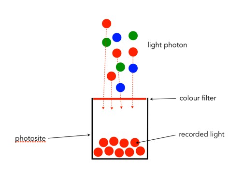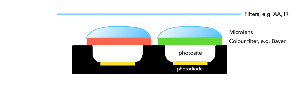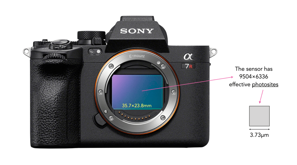 There are two major differences between photosites and pixels. Firstly, photosites are physical entities, pixels are not, they are digital entities. Secondly, while photosites have a size, and are different based on the sensor type, and number of photosites on a sensor, pixels are dimensionless. For example each photosite on the Sony a7RV has a pitch (width) of 3.73µm, and an area of 13.91µm2.