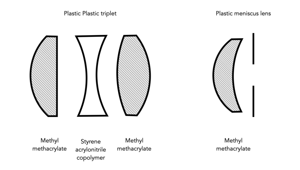 Plastics were said to suffer from defects, e.g. becoming pitted, or discoloured. However as they were usually used in simple, small lenses, this was hardly ever a real issue. Scratching (of the outer lens) was reduced through the use of plastics like Plexiglas V100, another acrylic which is very hard. The biggest issue with plastic lenses centred around the index of refraction (IR), which is a dimensionless number that indicates the light bending ability of a medium. The IR of plastics was (and is) rather low compared to optical glass. Acrylic has an IR of 1.49, and styrene acrylonitrile copolymer, 1.57. Compare this against modern glass of the period, at 1.52 to 1.89. Another problem was the fact that the IR of acrylics decreases as temperatures increases, changing the focus. Some plastic lenses were designed to automatically compensate for this. For example the plastic f/8 Cooke triplet, which used lens elements made from both acrylic and SAC. The focus of the acrylic elements (front and rear) increases, while the focus of the middle SAC lens decreases, balancing out any changes in focus.