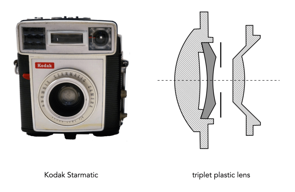 Many of the cameras that use(d) plastic lenses are considered to be “toy” cameras. In 1959 Kodak introduced the Starmatic, the top of Kodak’s Brownie line. It had an 44mm f/8 three-element, plastic lens. The Lomography Diana appearing in the 1960s, and was made entirely of plastic (and in 1975 cost less than $2). The Polaroid Pronto Land camera (mid 1970s), also had a 116mm 3-element Polatriplet plastic lens. Most Holga cameras, had a 60mm f/8 plastic meniscus lens.