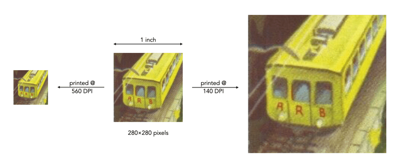 DPI implies dots-per-inch, and refers to the resolution value of a physical printing (or scanning) device. Printers reproduce an image by spraying out tiny dots, and the number of dots per inch affects the amount of detail and overall quality of a print. Figure 3 shows the 280×280 image printed out on three devices, one with 280dpi, one with 560dpi, and a third with 140dpi. The lower DPI results in a larger, if somewhat coarser, image. In all cases, the ratio of dot to pixel is 1:1, it’s just the size of the dots that changes. In the first case, 280dpi means that each dot is 1/280″ in size, and the image is printed in an area of 1″×1″. In the second case, the size of each dot is 1/560″, so the image printed in a space of ½”×½”. In the final case, the size of each dot is 1/140″, so the image printed in an area of 2″×2″.