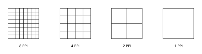PPI stands for pixels-per-inch, and is the pixel density associated with digital devices typically used to view images. PPI only becomes useful when an image is brought into the real world, for example displaying it on a screen. It refers to the number of pixels that a device (e.g. screen) can display within one inch of space. For example the iMac Pro has 5120×2880 pixels in its display, and its pixel density is 218ppi. The 6.1″ iPhone 12 has a 2532×1170 display with 460ppi. The higher the value for PPI, the greater the pixel density, and the smaller the size of the pixels. Images shown on devices with higher dpi often appear sharper than those displayed on low resolution devices. However this is also dependent on your distance to the device, and the how good your eyes are. The examples in Fig.1 show examples of various pixel densities.