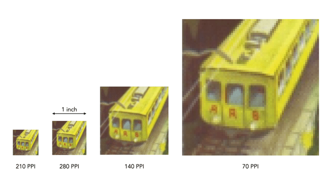 To illustrate how PPI of a device affects the display of an image, consider the example shown in Fig.2. A 280×280 image has been shown simulated on four devices with differing values of PPI: 210, 280, 140, and 70. Higher pixel densities makes the image look sharper – for example at 280ppi, the entire image fits into the 1″×1″ region on the screen. At 70ppi it takes 4″×4″=16in2 to display the same image, which means a much lower resolution where parts of the image may start to look “blocky” and edges appear jagged.