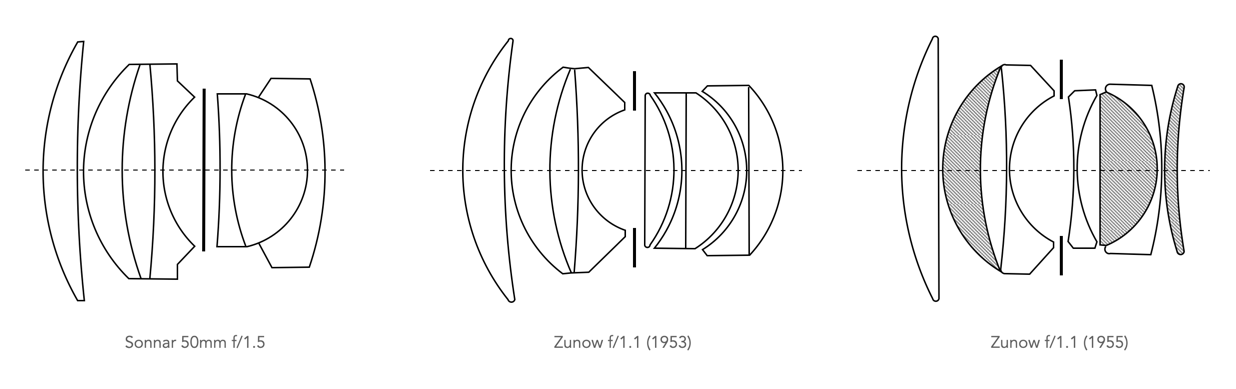 The patent for the Zunow f/1.1 lens [3] describes the lens as “an improved photographic objective suited for use with a camera that takes 36×24mm pictures”. The lens had a configuration of 9 elements in 5 groups, in a Sonnar-type design, likely derived from the Sonnar 50mm f/1.5. It was available in mounts for Contax, Nikon and Leica rangefinder cameras. The amazing thing about this lens is the fact that it was not constructed using any “rare earth” glasses.