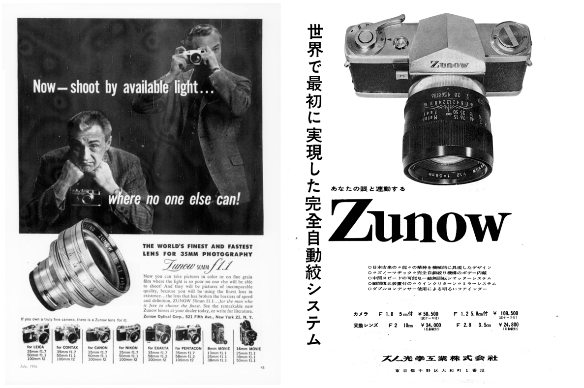 The 1950s photographic industry in Japan was marked by a race to develop the fastest lens. In December 1950, Nippon Kogaku, maker of the Nikon, would introduce the Nikkor 50mm f/1.4, the fastest normal lens produced. But the victory was short lived, as in 1953 an even faster f/1.1 lens was introduced by a little known company – Zunow.
