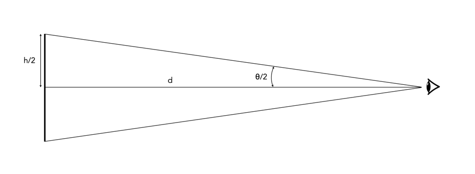 Where h, is the resolution, and can be ppi for screens, and dpi for prints. So if h=300, then d=11.46 inches. Now to calculate the optimal viewing distance involves a magic number – 3438. Where does this number come from? Few descriptions actually give any insights, but we can can start with some basic trigonometry. Consider the diagram in Figure 2, where h is the pixel pitch, d is the viewing distance, and θ is the angle of viewing.
