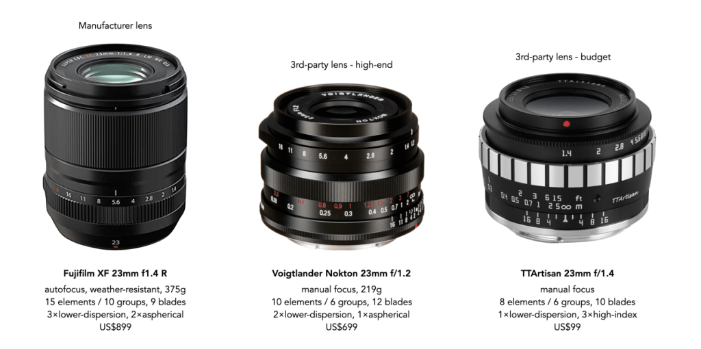 Actually the main problem in choosing lenses from 3rd-party manufacturers is differentiating between them. Because apart from the price differential, the specs of many lenses look quite similar. Below are five third-party 12mm lenses for the Fuji-X system (Fuji does not make a 12mm, the closest is a 14mm f2.8).